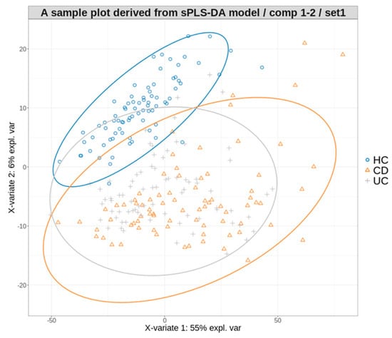 No studies have used sPLS-DA to differentiate between patients with IBD and healthy controls (HCs) or between patients with UC and CD. Therefore, we implemented a prediction model using ML with sPLS-DA to distinguish between both IBD and HC and UC and CD, demonstrating its performance [20].