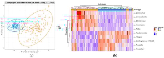 (a) A PLS projection in the subspace defined by the sPLS−DA model’s first two components, developed for discriminating between IBD and HC. (b) A heatmap representing the abundance of high−contributing phylotype features for predicting the IBD and HC groups in the test set.