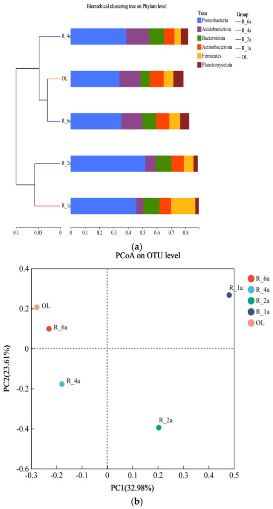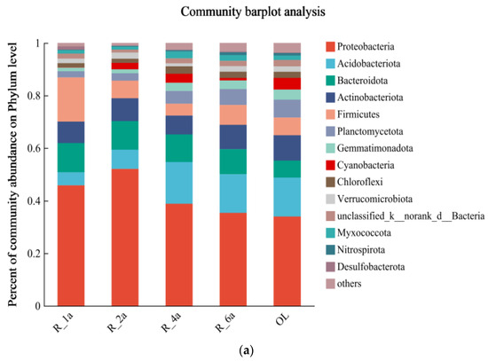 Venn diagrams illustrated species and genus distribution across treatments, demonstrating that 512 species and 314 genera were shared among all samples (Figure 2c). Furthermore, each of R_1a, R_2a, R_4a, R_6a, and OL had a specific species and genus. Specifically, R_1a, R_2a, R_4a, R_6a, and OL had 707 and 175, 266 and 46, 266 and 58, 298 and 48, and 275 and 48 specific species and genera, respectively. The analysis indicated significant differences (p < 0.05) in bacterial communities among soils with varying reclamation times (R_1a, R_2a, R_4a, R_6a, and OL) at the genus level and higher taxonomic levels (Figure S1).