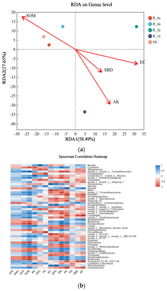 In the initial treatment years, R_1a and R_2a, all seven phyla were predominant, with varying abundances. At R_1a, they included Proteobacteria (45.84%), Firmicutes (16.80%), Bacteroidota (11.15%), Actinobacteriota (8.16%), and Acidobacteriota (4.94%). After one year, Proteobacteria, Acidobacteriota, and Actinobacteriota increased by 6.25%, 2.35%, and 0.49%, respectively, while Firmicutes and Bacteroidota decreased by 10.09% and 0.24%, respectively. With continuous recovery until the natural state, R_4a, R_6a, and OL, the proportion of unclassified read segments rose from 2.63% to 3.65% (Figure 2b). The abundance of Proteobacteria, Acidobacteriota, and Bacteroidota gradually decreased. R_4a exhibited a 4.87%, 1.09%, and 3.96% increase compared to OL, respectively. Meanwhile, Actinobacteriota, Firmicutes, and Planctomycetota gradually increased, with R_4a being 2.43%, 2.23%, and 2.00% lower than OL, respectively. Proteobacteria predominated with a surprising 52.09% of readings (R_2a), and a minimal 0.94% remained unclassified in the hierarchy (Figure 2b). At the genus level, five dominant genera were found: Bacillus, Lysobacter, Sphingomonas, norank_f__norank_o___Vicinamibacterales, and Ferruginibacter. Notably, changes in the genus-level bacterial community structure were influenced by reclamation treatments. Approximately 46.64% (ranging from 36.78% to 50.52%) of the total sequencing reads remained unclassified at the genus level. Specifically, Bacillus declined from 4.65% in R_1a to 1.68% in R_2a before rebounding to 4.24% in OL (Figure S1). Lysobacter exhibited an increase from 3.10% in R_1a to 8.30% in R_2a, then dropped to 0.14% in OL. Sphingomonas increased from 0.97% in R_1a to 4.83% in R_2a and remained at 2.46% in OL. Norank__f__norank__o___Vicinamibacterales expanded from 1.59% in R_1a to 3.49% in OL. Ferruginibacter showed modest growth during reclamation, peaking in R_2a with a 2.17% increase compared to OL. Additionally, some bacterial taxa exhibited varying correlations with the soil environment across different years (Figure 3). Members of the Planktonophage, Nitrospiraea, and Unclassified Bacteria phyla were present in very low abundance in all soil samples.