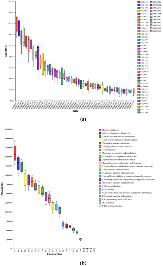(a) COG Abundance Box plot depicting functional abundance statistics. Note: Horizontal coordinates represent COG function numbers, and vertical coordinates represent functional abundance. (b) Box Plot showcasing COG Functional Classification Statistics. Note: Horizontal coordinates represent COG secondary function numbers, and vertical coordinates represent functional abundance. (c) Phylogenetic Tree. The left side displays the phylogenetic evolutionary tree, with species represented by branches. Branches are color-coded to indicate higher taxonomic levels, and branch length represents evolutionary distances between species, signifying their degree of difference. The right-side bar chart indicates the proportion of reads from various subgroups.