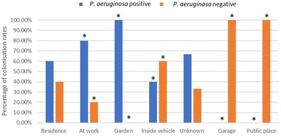 Effect of environmental location of burn incident on P. aeruginosa colonisation rates (%). * Indicates significant difference of p < 0.05.