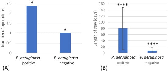 (A) Number of operations that resulted in P. aeruginosa-positive and -negative patients. (B) The length of stay for patients positive for P. aeruginosa compared to patients negative for P. aeruginosa. * Indicates significant difference of p < 0.05 and **** significant difference of p < 0.001.