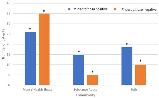 Mental health illness and substance abuse were the most common comorbidities observed (Figure 4). Mental health illness demonstrated significantly fewer P. aeruginosa-positive patients (25.9%) than P. aeruginosa-negative patients (35%). However, patients that suffered from substance abuse demonstrated significantly higher numbers of isolated P. aeruginosa (14.8%) than non-isolated P. aeruginosa (5.0%). Patients that suffered from both mental health illness and substance abuse also demonstrated significantly higher numbers of P. aeruginosa (18.5%) than wounds where P. aeruginosa was not isolated (10.0%).