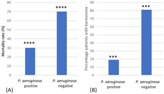 Mortality rate of burn patients. (A) Mortality rates (%) of P. aeruginosa-positive and -negative patients. (B) Mortality rates (%) of patients with P. aeruginosa bacteraemia and those who were P. aeruginosa-negative. *** Indicates significant difference of p < 0.005, **** significant difference of p < 0.001.