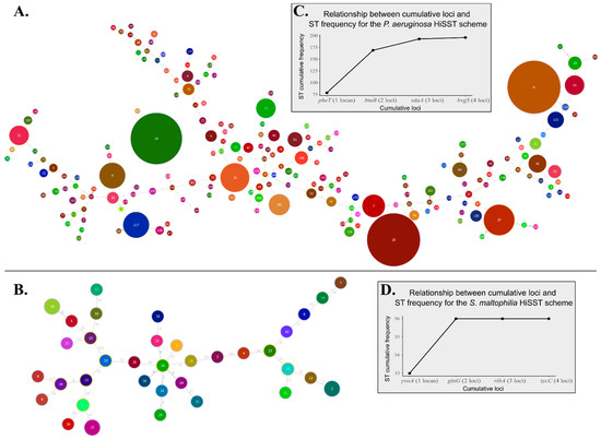 Minimum spanning trees for HiSST schemes of (A) Pseudomonas aeruginosa and (B) Stenotrophomonas maltophilia based on SNP analysis. The distance labels represent the number of discriminating SNPs between neighbouring genotypes. Each pie chart label refers to sequence type (ST) identifier of the corresponding HiSST scheme. The ST diversity is displayed by the grey boxes, illustrating the relationship between ST frequency and the number of loci included in the (C) P. aeruginosa or (D) S. maltophilia HiSST scheme.
