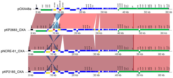 The plasmid structures of blaOXA-48 harbor plasmids. The open reading frames were depicted as blocks. Black, yellow, red, green, and blue blocks represent replication genes, mobile elements, antimicrobial resistance genes, plasmid transfer genes, and plasmid backbone genes, respectively. Genes in the forward direction were located above the central line, while genes in the reverse direction were located below. The turkey red shading indicates regions of shared homology in the same direction among the different elements, while the blue shading signifies inverted shared homology.