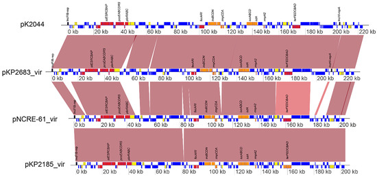 Figure 1 presents the plasmid structures of blaOXA-48 harboring plasmids. Figure 2 presents the plasmid structure of virulence plasmids from NCRE-61, KP2185, NTUH-K2044, and KP2683. These virulence genes were found on the virulence plasmids of the three strains (pKP-2683-vir, pNCRE-61-vir, and pKP2185-vir). KP-2683 was unique in containing an additional copy of rmpADC on the chromosome in ICEKp1. It should be noted that the rmpA gene on pKP-2185-vir and pNCRE-61-vir were truncated due to a frameshift, while the rmpA2 gene on pKP2683-vir was also truncated. pKP2683-vir showed >99.9% nucleotide identity and ~98% query coverage against plasmid pK2044 from the K1 prototype strain NTUH-K2044. pNCRE-61-vir and pKP-2185-vir had 99.9% identity but ~92% query coverage against pK2044 (Figure 2). In addition, pNCRE-61-vir and pKP-2185-vir only contain a single replicon of IncFIB (repB_KLEB_VIR), while the second IncHIB (pNDM-MAR) found in p2683-Vir was missing. Overall, the three blaOXA-48 harboring plasmids, pKP-2683-OXA, pNCRE-61-OXA, and pKP2185-OXA, are highly similar to the blaOXA-48 prototype plasmid pOXA48a [22,24], with 94–96% query coverages and ~99.8% nucleotide identity (Figure 1). The main difference is that the blaOXA-48 in pOXA48a is harbored by a Tn1999.1 element, while it was carried by a Tn1999.2 transposon in three plasmids sequenced in the current study.