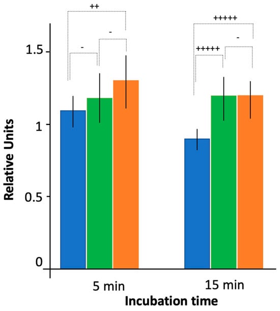 Ciprofloxacin accumulation by bacteria devoid of the efflux pump as assessed by fluorescence bulk measurements. Blue: AG100A hfq+; green: AG100A ∆ctr; orange: AG100A ∆hfq. Note that to compare results between the different conditions and experiments, fluorescent units were normalized to 1 using WT AG100 strain after 5 min of incubation with CIP as a reference (presented on Figure 4). Quantitatively, an exposure time to ciprofloxacin of 5 min for AG100 (our reference) corresponds approximately to 60,000 molecules/bacteria. The t-test was used to determine if the differences between intracellular CIP concentration for WT and mutated Hfq strains were significant (- p < 0.25; ++ p < 0.1; +++++ p < 0.01).