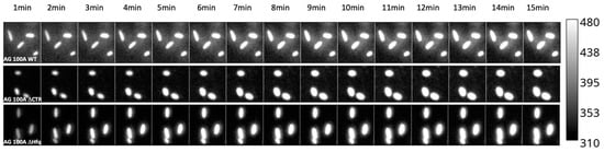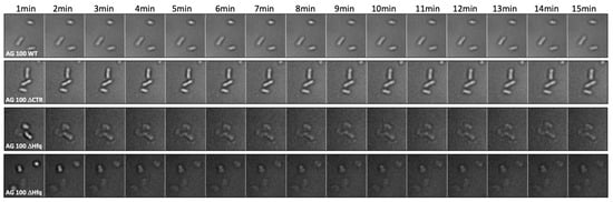 As shown in Figure 1, at the population level CIP accumulated more efficiently in the strain devoid of both Hfq and AcrB (AG100A ∆hfq) than in the strain only devoid of AcrB (AG100A). This is observed at 5 and 15 min. The accumulation ratio (e.g., the ratio of ciprofloxacin in AG100A hfq+/AG100A ∆hfq) was ~1.3 at 5 and 15 min. This effect was also observed for the ∆ctr strain, where Hfq devoid of its CTR-amyloid region is present, but the difference was less pronounced (accumulation ratio ~1.2), and the significance of the difference observed between ∆hfq and ∆ctr in the ∆acrB genetic background was not clear (p < 0.25). To complement and confirm measurements at the population level, we performed measurements at the single-cell level.