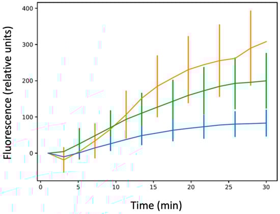 Ciprofloxacin accumulation at the single-cell level in bacteria devoid of the efflux pump. Blue: AG100A; green: AG100A∆ctr; orange: AG100A∆hfq. The results are shown as mean values from 20–30 bacteria analysed for at least three different pre-cultures, with error bars indicating SD. The one-way ANOVA analysis of variance followed by a Tukey’s post hoc test was used to compare the means between strains AG100A vs. AG100A∆hfq, AG100A vs. AG100A∆ctr, and AG100A∆hfq vs. AG100A∆ctr at the last recorded time point, which showed that the means of all pairs are significantly different with a p-value lower than 0.01. See also Supplementary Table S1.