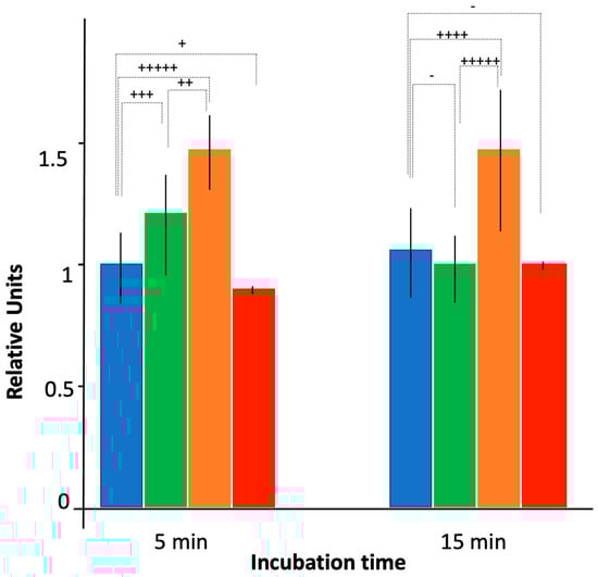 Ciprofloxacin accumulation as assessed by fluorescence bulk measurements. Blue: AG100; green: AG100 ∆ctr; orange: AG100 ∆hfq; red: AG100/pBRpLacMicF. As in Figure 1, fluorescence units were normalized to 1 using WT AG100 strain after 5 min of incubation with CIP as a reference. Quantitatively, the exposure time to ciprofloxacin of 5 min for AG100 corresponds approximately to 60,000 molecules per bacteria (our reference here in blue). The t-test has been used to determine if the differences between intracellular CIP concentration for WT and mutated Hfq strains are significant (- p < 0.25; + p < 0.2; ++ p < 0.1; +++ p < 0.05; ++++ p < 0.025; +++++ p < 0.01). Note that variances have similar values, except for the strain expressing MicF where the variance is very small, suggesting a part of the variability between cells comes from influx of CIP.