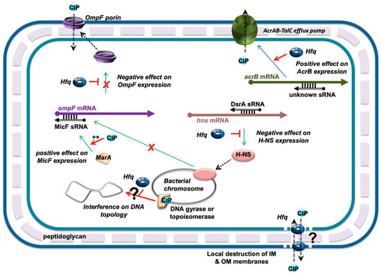 Under normal conditions of growth, the production of MicF sRNA occurs at a low level, but the presence of antibiotics increases transcription of micF [56]. The expression of micF is indeed increased by the MarA transcriptional activator in the presence of CIP, resulting in impairment of the ompF expression [65,66]. Reduced expression of ompF thus favors the resistance to CIP. Conversely, strains devoid of Hfq are more sensitive to FQ as no negative regulation of ompF by MicF occurs [37].