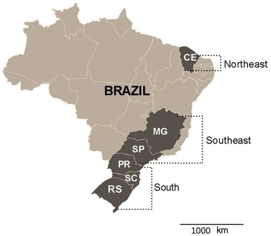 Map of Brazil, highlighting the South, Southeast, and Northeast Regions and the Brazilian states sampled in the present study, being Rio Grande do Sul (RS), Santa Catarina (SC), Paraná (PR), São Paulo (SP), Minas Gerais (MG), and Ceará (CE).