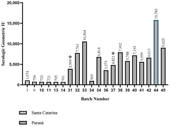As a result, 20% of the samples showed the presence of antibodies against aMPV. The positive samples were concentrated in the southern region of Brazil, as 70% came from Paraná and the remaining 30% from Santa Catarina. In the State of Paraná, the results indicate positivity in 14 of the 30 batches sampled, revealing a seroprevalence for aMPV of 46.6% of the batches evaluated, with an average titratable weight of 6881.4 IU. In Santa Catarina, the results indicate positivity in six of the fifteen batches sampled, with aMPV seroprevalence of 40% of the batches evaluated, with a titratable average of 780 IU (Figure 2).