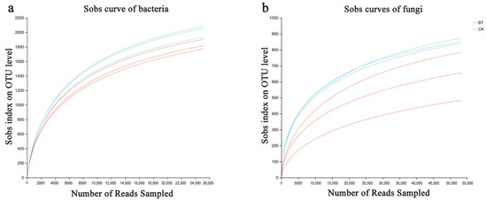 Bacterial (a) and fungal sobs curves (b) were examined to assess the impact of a 3% dissimilarity cutoff on the identification of uncovered operational taxonomic units (OTUs). The abbreviation “BT” refers to perennial poplar big trees, while “CK” denotes replanting poplar seedlings in continuous cropping soil. Each treatment was subjected to analysis in triplicate.