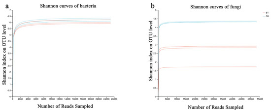 Based on the sequencing data, 49,207 and 50,480 bacterial 16S rDNA sequences were obtained for the BT and CK groups, respectively, as well as 63,079 and 68,753 fungal ITS sequences for the BT and CK groups. Utilizing a clustering dissimilarity cutoff of 3%, the reads were categorized into various operational taxonomic units (OTUs). The Sobs diversity rarefaction curves for both bacterial and fungal communities did not reach an asymptote at a distance level of 0.03 (Figure 1), indicating that not all communities present in the samples were adequately represented by the sequencing data. Nevertheless, the Shannon diversity index and rarefaction curves were integrated to obtain a more comprehensive picture of diversity within communities (Figure 2). According to the Shannon diversity curves, as the number of reads increased, the curves plateaued, indicating that sufficient data were collected to examine communities.