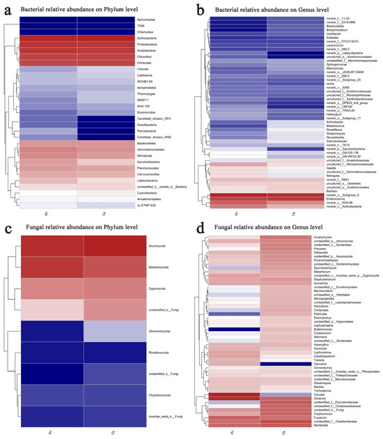 The Mothur program was employed for sequence classification. In the BT and CK groups, the Actinobacteria phylum constituted 26.67% and 30.21%, respectively, followed by Proteobacteria with 18.60% and 18.29% in the BT and CK groups, respectively, and Acidobacteria with 17.99% and 16.70% in the BT and CK groups, respectively. Regarding the dominant fungal phyla, Ascomycota accounted for 51.52% and 63.76% in the BT and CK groups, respectively, while Basidiomycota represented 39.84% and 21.78% in the BT and CK groups, respectively (Figure 3a,b). The results of the heatmap analysis provided confirmation that Actinobacteria, Proteobacteria, and Acidobacteria were the prevailing bacterial phyla, whereas Ascomycota and Basidiomycota emerged as the dominant fungal phyla (Figure 4a,c).