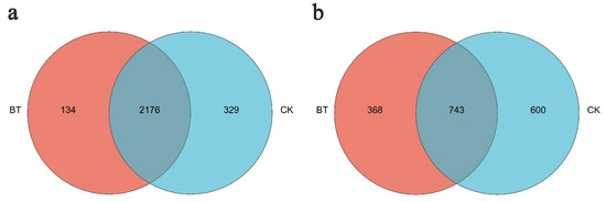 Unique and shared OTUs of (a) bacteria and (b) fungi for the two groups in Venn diagram. “BT” means perennial poplar trees, while “CK” means replanting poplar seedlings in continuous cropping soil. We analyzed three replicates for every treatment.