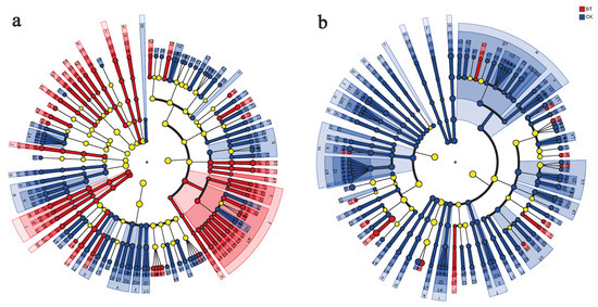 Discriminant analysis of muti-level species differences through LEfSe analysis. (a) Differences of bacterial multi-level species in the BT and CK groups. (b) Differences of fungal multi-level species in the BT and CK groups. Different colored nodes represent microbial communities that are significantly enriched in their corresponding groups and have a significant impact on inter group differences.