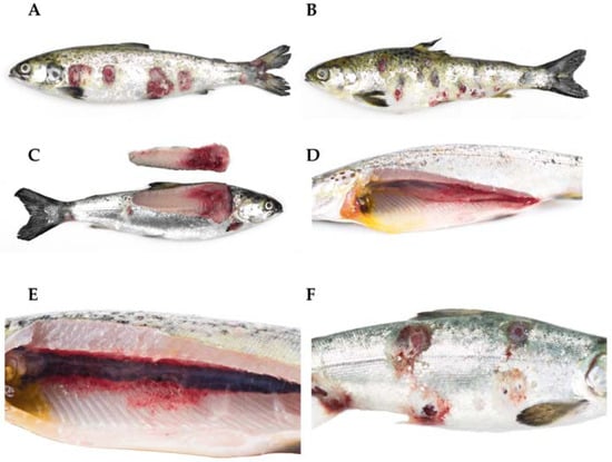 Atlantic salmon (Salmo salar) in the freshwater phase are affected by a clinical presentation of atypical furunculosis caused by atypical Aeromonas salmonicida. (A,B) Multiple ulcers are observed, with some surrounded by a white-colored border. (C) Loss of structure and muscle hemorrhages are observed. (D) Petechial hemorrhages are observed in the swim bladder. (E) Atlantic salmon (S. salar) affected by a clinical picture of atypical furunculosis (atypical A. salmonicida). The presence of perirenal muscle hemorrhages is observed. (F) Atlantic salmon (S. salar) affected by a clinical picture of atypical furunculosis (atypical A. salmonicida). Periocular hemorrhage, exophthalmia, and multiple ulcers are noted, some of which have coalesced.