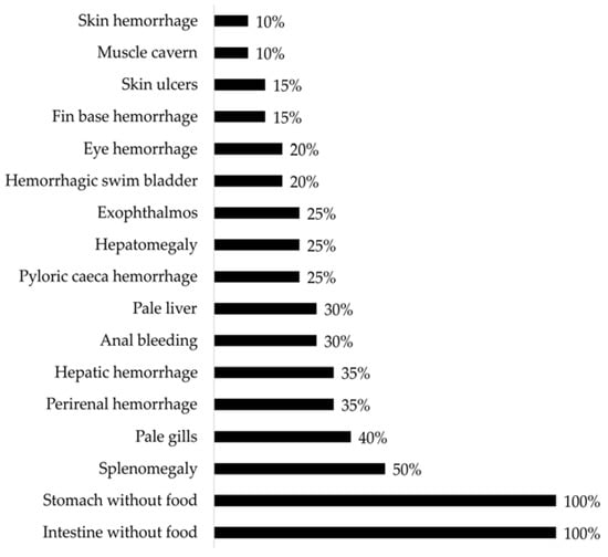 Some of the clinical signs illustrated were decreased appetites, increased lethargy, and exophthalmia (protrusion of the eyeball). Externally, the affected fish may have exhibited periorbital hemorrhages (around the eyes), hemorrhages at the base of the fins, and hemorrhages in the abdomen, anus, and the peduncle. Sometimes, the presence of bullae, which are fluctuating areas upon palpation called furuncles which correspond to muscular necrosis, could also be observed. Further, desquamation, erosion, and/or skin ulcers, whether singular or multiple, individual or coalescent, resulted in exposure of the musculature and edges displaying a white or red coloration. Internally, the affected fish exhibited petechial hemorrhages in the liver, swim bladder, heart, visceral fat, and perirenal hemorrhages; variable findings may include nephromegaly (enlarged kidneys) and splenomegaly (enlarged spleen). Finally, hemorrhagic enteritis and hyperemic gastric mucosa were observed in the gastrointestinal system (Figure 1 and Figure 2).