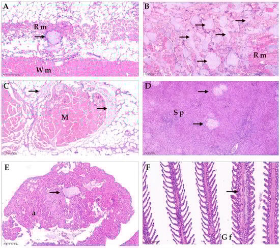 (A) Atlantic salmon (Salmo salar), red muscle (H&E). Colonies of bacteria with coccobacillary morphology and grey colored are observed in red muscle (Rm), consistent with atypical Aeromonas salmonicida infection (arrow). (B) Atlantic salmon (S. salar), red muscle (Rm) (H&E). Observation of diffused infection of bacteria with coccobacillary morphology, consistent with atypical A. salmonicida infection. Additionally, hemorrhage and necrosis of the muscle tissue are observed. (C) Atlantic salmon (Salmo salar), muscle tissue (H&E). Surrounding the muscular tissue (M), the presence of coccobacillary bacterial colonies consistent with infection by atypical A. salmonicida is observed (arrow). Additionally, muscular necrosis and hemorrhage are observed. (D) Atlantic salmon (S. salar), spleen (H&E). In the splenic parenchyma (Sp), multiple colonies of bacteria with coccobacillary morphology are observed, consistent with atypical A. salmonicida infection (arrows). (E) Atlantic salmon (S. salar) Auricle (H&E). Colonies of bacteria with coccobacillary morphology are observed in the auricle (a), consistent with atypical A. salmonicida infection (arrow). (F) Atlantic salmon (S. salar), gill (H&E). Bacterial infiltration of the center gill filament (Gf) with coccobacillary morphology is observed, consistent with atypical A. salmonicida infection (arrow). Wm: white muscle.