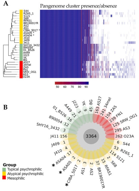 The PIRATE toolbox was applied to 28 complete A. salmonicida genomes, from which 3 strains are reported in this study and 25 were retrieved from NCBI [] as described in a previous pangenome characterization []. The pangenome of A. salmonicida comprised 7296 gene families, of which 3364 (46.11%) were classified as core (>95% genomes) and 3932 (53.89%) as accessory. The analysis of the present/absent gene families showed remarkably distinct patterns between the mesophilic and psychrophilic strains, as well as within the typical and atypical psychrophilic strains. Moreover, the landscape of the present gene families seems to be heterogeneous among the atypical psychrophilic strains (Figure 4A). The genomes described in this study, ASA04, ASA05, and CIBA_5017, contained 17, 2, and 2 unique gene families, respectively (Figure 4B).