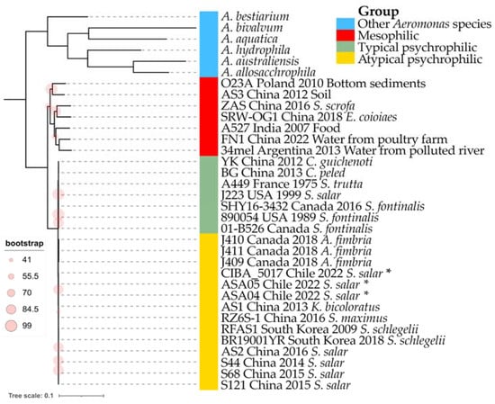 Phylogenomic analysis of Aeromonas salmonicida strains. Maximum likelihood phylogenetic tree constructed from a core genome alignment encompassing 89,915 SNPs. * Genomes described in this study. Bootstrap frequencies above 70% are represented as red circles. Other representative Aeromonas species are included as outgroup isolates. The country of origin, year of collection, and host/source are shown if available.