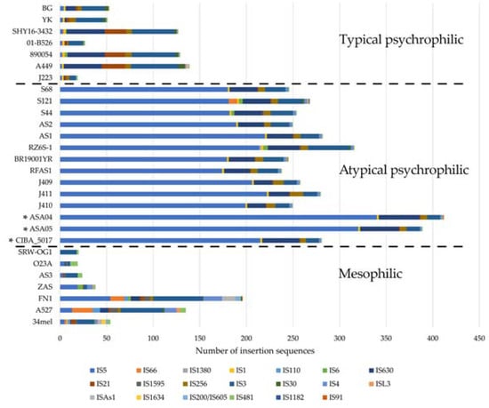 To further characterize the genomic structure of the genomes analyzed in this study, their insertion sequence (IS) and R-M system repertoires were described. Three main patterns of IS composition were found in the 28 genomes included in the analysis, as described elsewhere []. This pattern shows a trend indicating that the mesophilic, typical psychrophilic, and atypical psychrophilic strains include clear differences in their IS composition. The three genomes described in this study fall within the expected pattern of atypical psychrophilic strains, whereby the IS5 family is the most abundant. Notably, the ASA04 and ASA05 genomes show a higher number of insertion sequences compared to other atypical psychrophilic strains (Figure 6).