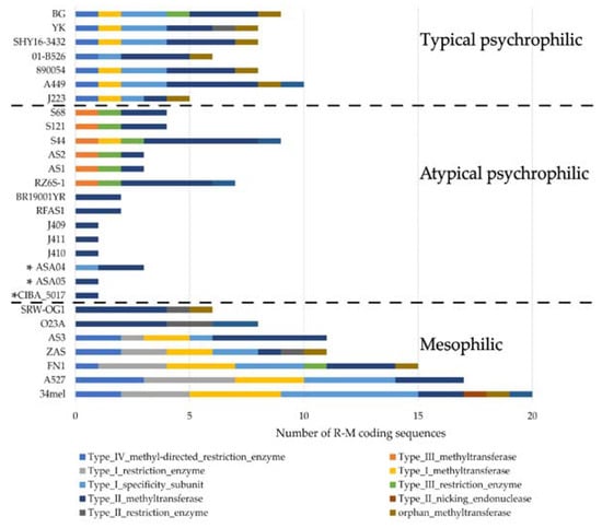 Furthermore, distinctive patterns of R-M coding sequences were found among the mesophilic, typical psychrophilic, and atypical psychrophilic strains (Figure 7). Remarkably, contrasting patterns appeared in the ISs and R-M coding sequences observed in the atypical psychrophilic strains, with respect to other strains. The IS number is more abundant in the atypical psychrophilic strains compared to the mesophilic strains. In contrast, the number of R-M coding sequences identified in the atypical psychrophilic strains is less abundant than in the mesophilic strains. Moreover, two distinctive patterns of R-M coding sequences are evident within the mesophilic strains, as well as among the atypical psychrophilic strains.