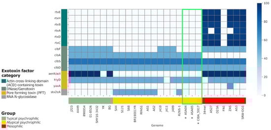 Virulence factors (VFs) were predicted in the genomes included in the present study and compared with complete A. salmonicida genomes available from NCBI []. The presence of virulence factor classes was mostly homogeneous between the compared strains (Supplementary Figure S3). However, regarding exotoxin factors, the mesophilic strains showed the presence of actin cross-linking domain (ACD)-containing toxin factors, which were absent in the psychrophilic strains (Figure 8). Additionally, minor differences were observed regarding the pattern of exotoxin factors between the typical and atypical psychrophilic isolates. Specifically, the DNAse/genotoxin factor clbF was present in all typical psychrophilic but not in the atypical psychrophilic isolates, except for in samples J410, J411, and J409. Moreover, the pore-forming toxin factor aerA/act was present in most typical psychrophilic strains and in all mesophilic isolates yet was not in the atypical psychrophilic samples. Furthermore, the RNA N-glycosidase factor stx2eA highlights the differences within the atypical psychrophilic strains since it is present only in the S44, S121, S68, BR1900YR, RFAS1, AS1, AS2, and RZ6S-1 isolates. This virulence factor variability among atypical strains seems to be linked to the strains’ region of origin.