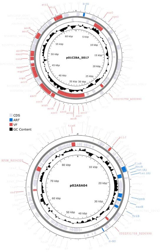 All three genomes described in this study contained plasmids with distinct factor compositions (Figure 9). Genomes ASA04 and ASA05 contained two plasmids each, while genome CIBA_5017 contained one plasmid. However, the total number of unique plasmids was three since these were subsequently found to be redundant. Plasmid p01CIBA_5017 was found in the three strains reported in this study. A BLASTn search against the NCBI database showed that p01CIBA_5017 aligned with the A. salmonicida strain S44 plasmid pS44-3 (98% query coverage and 99.95% identity). In contrast, plasmid p02ASA04 was only found in ASA04, and after performing a BLASTn search against the NCBI database, this plasmid produced hits illustrating a maximum query coverage of 53%, which suggests that it has not been described previously. Finally, plasmid p01ASA05 did not include virulence or antibiotic resistance factors and was only found in the ASA05 strain (not shown).