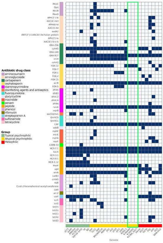 Antibiotic resistance repertoire in Aeromonas salmonicida complete genomes. The presence and absence of the factor are represented in blue and white, respectively. * Genomes reported in this study, with their results highlighted in the green box. Factors were filtered and considered as present as long as the local alignments had a similarity percentage ≥ 50%, e-value ≤ 1 × 10−6, and subject sequence coverage ≥ 80%.