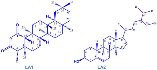 Chromatographic fractionation and purification of the bioactive EtOAc fraction led to the isolation of two compounds based on their 1H and 13C NMR, MS and FTIR data. The white amorphous crystals (compound LA1) were identified to be friedelane-1,3-dione triterpenoid, characterized as 4S,4αS,6αR,6βS,8αS,12αS,12βR,14αS,14βR-4,4α,6β,8α,11,11,12β,14α Octamethyloctadecahydropicene-1,3(2H,4H)-dione. The white amorphous powder (compound LA2) was identified as a phytosterol, characterized as β -sitosterol (Figure 1). The 1H NMR (600 MHz in CDCl3) and 13C (125 MHz in CDCl3) NMR data are shown in Table 2. Further spectral data and some physicochemical constants of the compounds are available in the Supplementary Materials, Figures S2–S4.