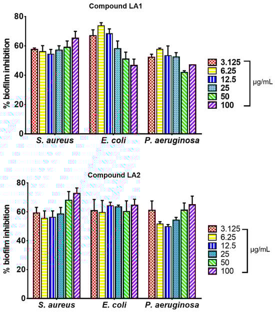 The effect of triterpenoid compounds LA1 and LA2 (3.1–100.0 µg/mL) on biofilm formation in S. aureus, E. coli and P. aeruginosa is presented on Figure 3. LA1 showed good antibiofilm activity against S. aureus (54–65%) and E. coli (47–74%) whereas it showed low to good activity against P. aeruginosa (42–57%). LA2 demonstrated good antibiofilm activity against S. aureus (56–72%), E. coli (60–65%) and P. aeruginosa (50–65%).