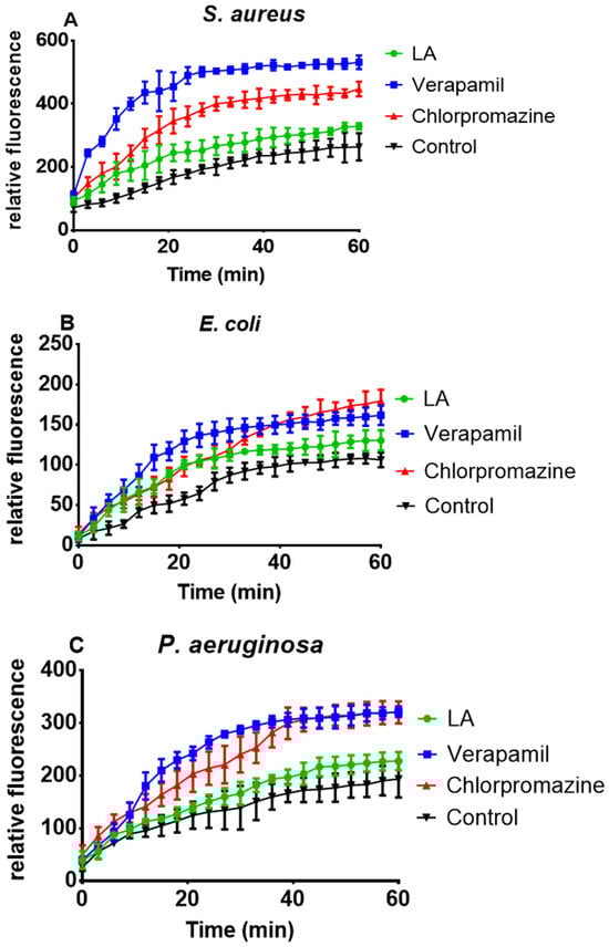 The EtBr accumulation assay was used to test the ability of the crude extract (LA) and isolated compounds (LA1 and LA2) to act as efflux pump inhibitors (EPIs). EtBr, a multidrug efflux pump substrate, emits a strong fluorescent signal when bound to DNA intracellularly but only a weak signal when present extracellularly. As a result of the retention of fluorescence over time if the efflux is reduced, the activity of putative EPIs can be measured fluorometrically [38]. The bacterial efflux pump phenomenon has been observed in P. aeruginosa, E. coli, and S. aureus [39]. P. aeruginosa and E. coli are classified as critical priority pathogens, whereas S. aureus is classified as a high-priority pathogen [40]. As generally known efflux pump expressors, P. aeruginosa, E. coli, and S. aureus were chosen for the efflux pump inhibitory effects.