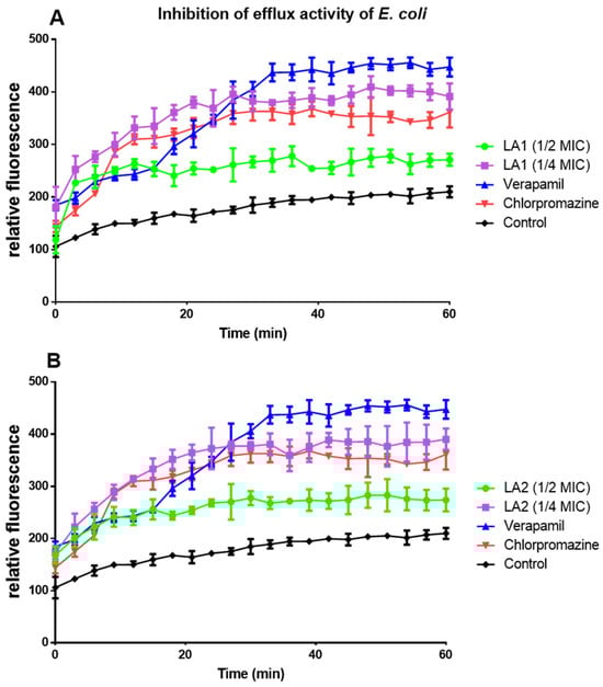 The effect of compounds LA1 (A) and LA2 (B) at ½ and ¼ MICs on the intracellular accumulation of EtBr in E. coli.