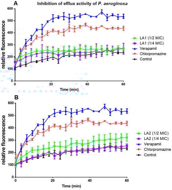 The effect of compounds LA1 (A) and LA2 (B) at ½ and 1/4 MICs on the intracellular accumulation of EtBr in P. aeruginosa.