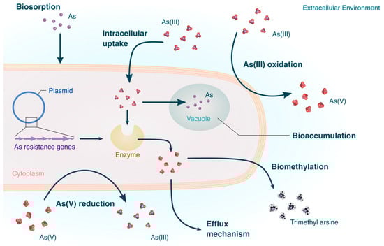 To provide a broader overview of the current understanding of microbial arsenic detoxification, the general framework for this review begins with a description of the gene systems found in microorganisms known to be activated in response to arsenic stress. This is followed by the enzymes upregulated by the previously discussed gene systems and the complementary biochemical processes involved to treat arsenic. Figure 1 provides a general schematic of some of the mechanisms discussed in this review Then finally, a summary of the most recent, representative microorganisms used in arsenic bioremediation are provided, as well as some of the trends, challenges, and future approaches the field must face.