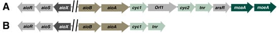 Examples of genetic organization of aio operons in a few arsenic-resistant microorganisms. Arrows represent open reading frame and the direction of transcription. Orthologs are represented in the same color. (A) Thiomonas arsenitoxydans [], (B) Acidovorax sp. NO-1 [].