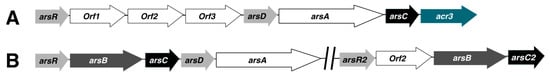 Examples of genetic organization of ars operons in a few arsenic-resistant microorganisms. Arrows represent open reading frame and the direction of transcription. Orthologs are represented in the same color. (A) Bacteroides vulgatus [], (B) Bacillus sp. [].