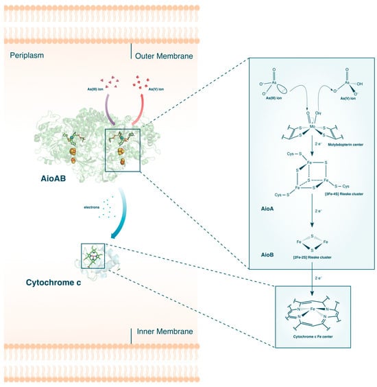 The aerobic oxidation of As(III) is primarily catalyzed by the As(III) oxidase, Aio (or AioBA) (see Figure 4). When challenged with As(III) stress, upregulation of aioBA genes occurs, which codes for the two subcomponents of Aio: the large α-subunit, AioA, and the small β-subunit, AioB. Crystal structures [,] of the protein complex revealed that the two subunits can be further subdivided into their individual redox active sites. The first active site is a molybdenum (Mo)-centered bis-pterin guanine dinucleotide surrounded by a network of protein residues and water molecules all connected by hydrogen bonds and salt bridges. Also found inside the AioA domain is a [3Fe-4S] Rieske cluster, while AioB contains a [2Fe-2S] Rieske cluster. Once expressed, these proteins are then translocated either to the periplasm or the cytoplasm and coupled with a c-type cytochrome [].