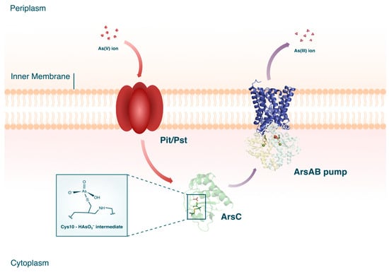 Cytoplasmic As(V) reductases are believed to be ubiquitous among microorganisms. Current knowledge on the ars genes separates the ArsC proteins into three different clades (see Section 3.2) which, while evolutionarily divergent, all effect the same molecular function []. The biochemical cascade of cytoplasmic As(V) reduction begins with the intracellular uptake of As(V) through phosphate membrane systems (see Figure 5). Due to As(V) being a chemical analog of phosphorus, As(V) ions can enter the bacterial cell through the periplasmic binding proteins, phosphate inorganic transport (Pit), or phosphate-specific transport (Pst). Once inside the cytoplasmic milieu, arsC coding for the As(V) reductase, ArsC, is upregulated. The conventional ArsC from S. aureus plasmid pI258 is a monomeric phosphatase spanning 135 amino acids with three bound cysteine residues []. These cysteine residues are essential for the enzymatic activity of ArsC as these facilitate the catalytic reduction of As(V) through a series of redox reactions: first, the thiol of the first cysteine (Cys10) covalently binds As(V) and reduces it to As(III); the resulting intermediate (Cys10-HAsO3−) is then attacked by the thiol of the second cysteine (Cys82), concurrently releasing the As(III); and the last step is the regeneration of the ArsC through the reduction of the intermediate by the third cysteine (Cys89).