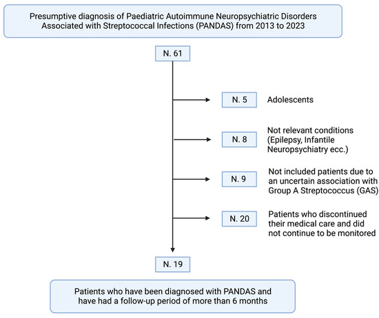 The retrospective process of inclusion of 61 children presenting to our center of Pediatric Rheumatology (created with BioRender.com). Based on the present classification criteria for PANDAS syndrome, the following patients were excluded: 5 had symptoms that appeared during or after puberty; 8 had clinical presentations that did not match the PANDAS syndrome (e.g., epilepsy, lack of tic disorder or OCD, complex patients with diagnosed neurological syndromes); 9 had an unconfirmed association with a Group A beta-hemolytic Streptococcus (GAS) infection; and 20 were lost to follow-up, resulting in the absence of a diagnosis. Thus, 19 children were ultimately diagnosed with PANDAS syndrome after a minimum of six months of follow-up.