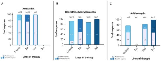 Treatment response to antibiotic drugs in the cohort of 19 patients diagnosed with PANDAS syndrome (created with BioRender.com). (A) Amoxicillin: 15 patients were treated with oral amoxicillin (50 mg/kg/day for 7–10 days), 14/15 as first-line treatment. All patients showed a good improvement; specifically, 12/15 had a partial response and 3/15 had a complete response. (B) Benzathine benzylpenicillin: 13 patients were treated with intramuscular benzathine benzylpenicillin (600,000 UI in children with less than 27 kg, 1,200,000 UI in children with more than 27 kg, every 21–28 days) for a median time of 14 months (1.0–82.0). A total of 4/15 were treated with benzathine benzylpenicillin as first-line treatments. A total of 12/13 showed a good improvement; specifically, 10/13 had a complete response and 2/13 had a partial response. A patient did not respond. (C) Azithromycin: 9 patients were treated with oral azithromycin (10 mg/kg/day for 3 days). A child was treated with azithromycin as first-line treatment with no response. A total of 7 patients showed a good improvement; specifically, 2/9 had a complete response and 5/9 had a partial response.