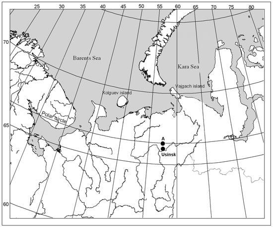 The sites studied are located at the Verkhnevozeyskoe oil field (Usinsky district, Komi Republic: 66°37′40″ N, 57°07′56″ E) (Figure 1), where oil spills occurred several times between 1989 and 1996 []. The study area is located in the forest–tundra zone and characterized by harsh climate conditions: low temperatures, strong winds, and a short growing season []; soils—stagnic cambisols [].