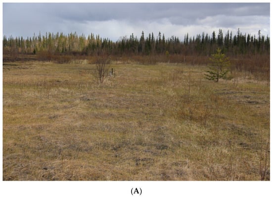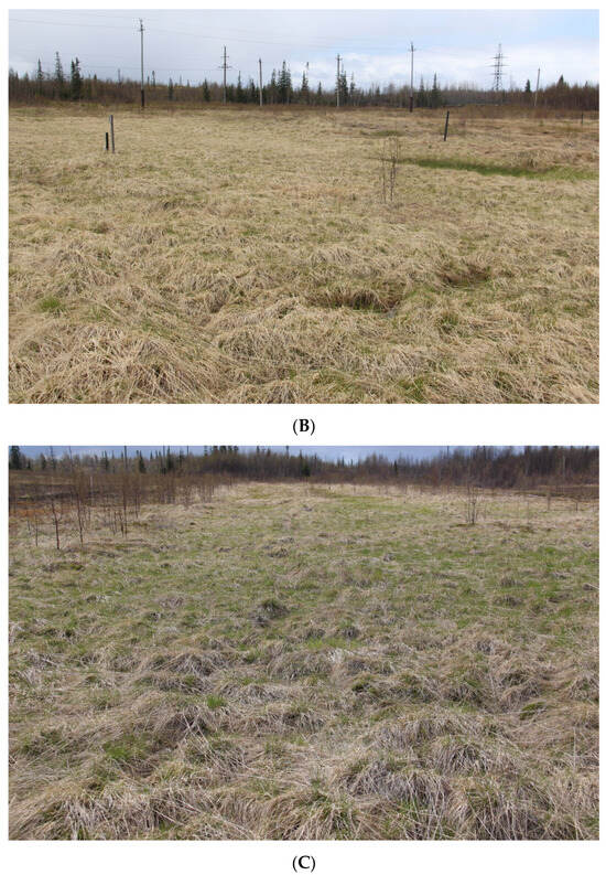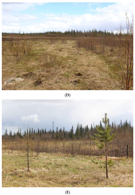 Experimental sites during the observation period (June 2019). (A) Site 2. Sedge-mixed herbs community. (The site exhibits natural regeneration, transitioning from a state of complete vegetation absence to a community dominated by sedges (Carex sp.) and cotton grass (Eriophorum sp.).); (B) Site 4. Mixed herbs–hairgrass community. (Predominance of turfed hairgrass (Deschampsia cespitosa), accompanied by the presence of other grass species in the herbaceous layer.); (C) Site 6. Mixed herbs–hairgrass community. (Turf pike complete dominance (Deschampsia cespitosa) over other species; the other species participation is not significant.); (D) Site 7. Mixed herbs–hairgrass community. (Soddy pike dominance (Deschampsia cespitosa) together with other grasses—reed grass (Phalaroides arundinacea) and purple reed grass (Calamagrostis purpurea); in addition, numerous young trees are represented.); (E) Site 9. Canary grass–mixed herbs community. (Phalaroides arundinacea dominance with the other grass species participation, sedges and various grasses with isolated young coniferous trees).