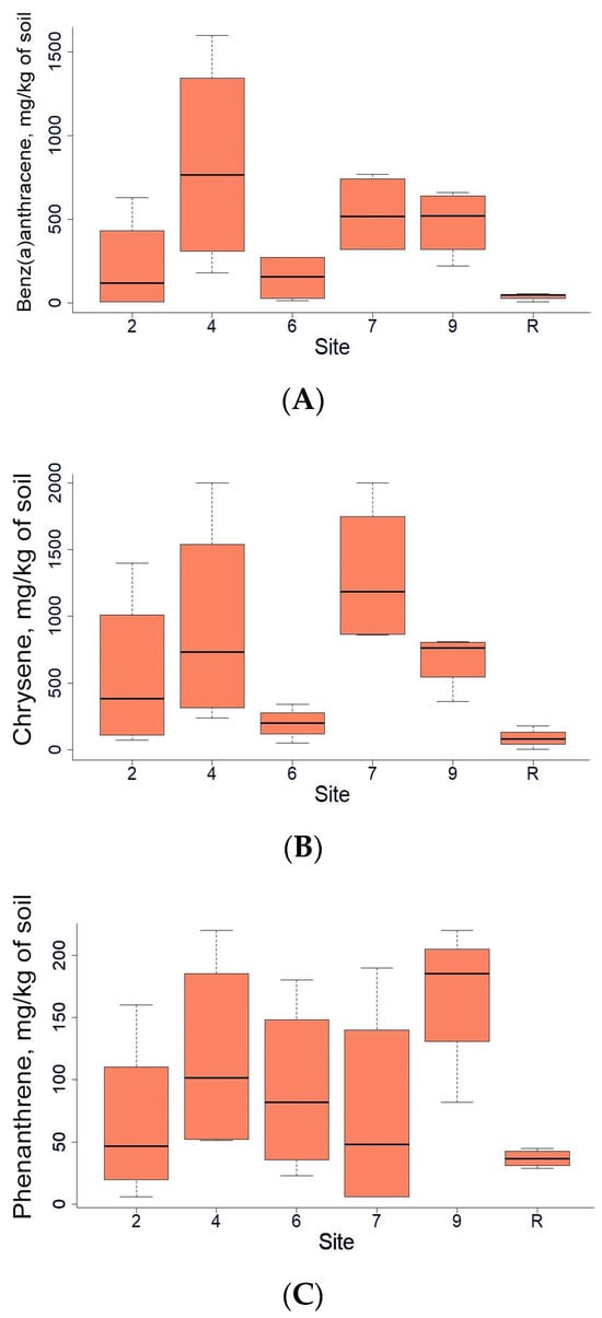 In addition to the total concentrations of TPH in the soil, the levels of several highly toxic [] polycyclic aromatic hydrocarbons were measured. Among them were Benz(a)anthracene, Chrysene, and Phenanthrene (Figure 3). Overall, significant differences between sites were not observed, but exact concentrations in some individual points were extremely high, while, in others, they were below the detection limit.