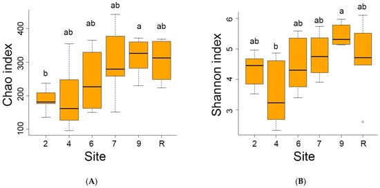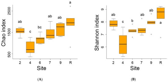 The Chao (A) and Schannon (B) diversity indices of bacterial communities on sites studied. Here and late significant differences between mean values (ANOVA, Student–Newman–Keuls test, p < 0.05) are indicated by different letters.
